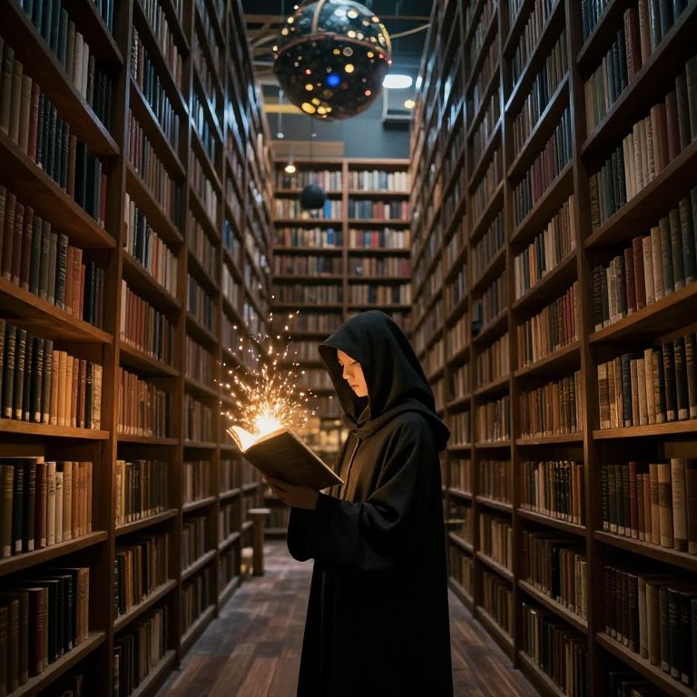 Photograph of a hooded figure in black standing in a dimly lit, narrow library aisle. The person, with their face mostly obscured, is holding an open book from which bright sparks are emanating. Tall, wooden bookshelves filled with books line both sides, creating a tunnel effect. Overhead, a modern, spherical light fixture with glowing dots illuminates the scene. The floor is wooden, adding warmth to the cool, blue-toned lighting. The atmosphere is mysterious and magical, with the sparks contrasting against the dark, shadowy environment.