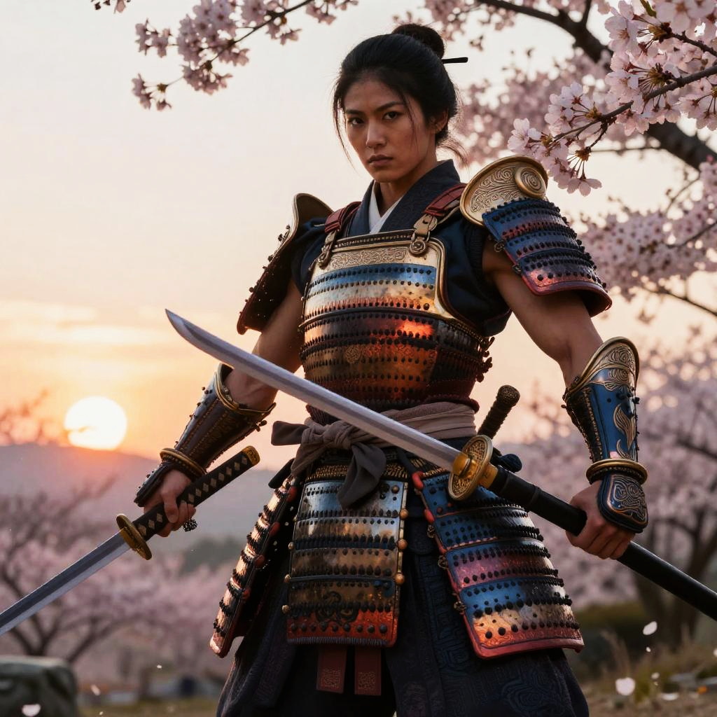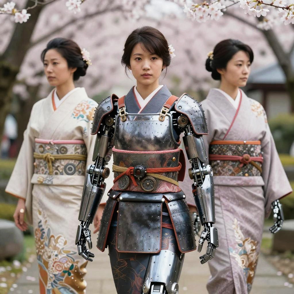 Japanese female robots in traditional kimono-inspired armor, blending ancient culture with advanced technology, serene garden background with cherry blossoms, soft lighting, intricate mechanical and organic elements