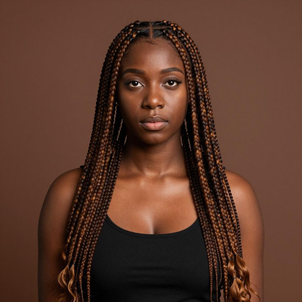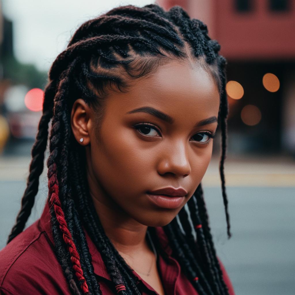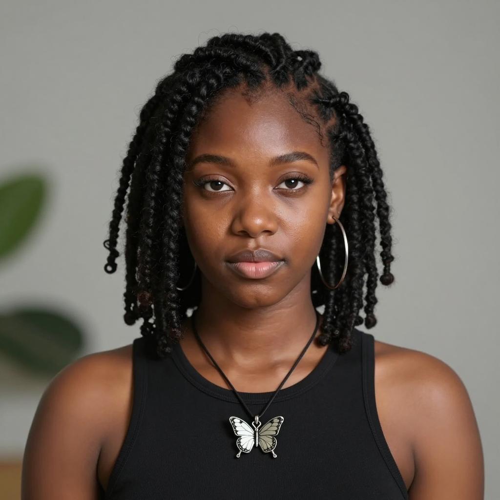 Beautiful box braid, photo of beautiful black woman, medium-dark skin tone, wearing hoop earrings and two layered necklaces, black spaghetti strap top, short twisted natural hair, serious expression, shallow depth of field, urban background, soft lighting, portrait shot, close-up, realistic style, bokeh effect, detailed facial features, smooth skin, elegant and stylish, realistic ures, daytime outdoor setting