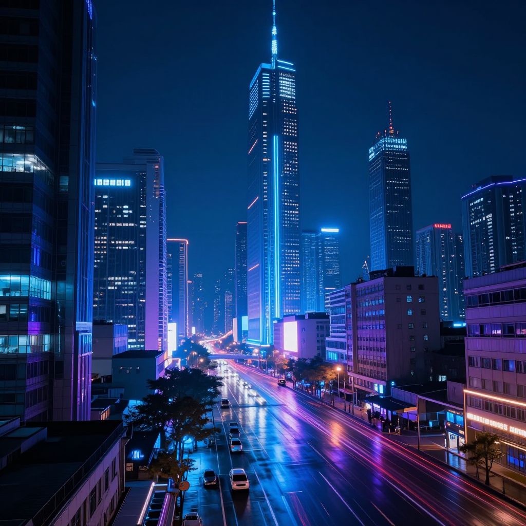 GTA filter on a futuristic city skyline at night, glowing skyscrapers, flying cars, moody fog, neon colors, high contrast with cinematic depth of field, gritty textures mixed with a cyberpunk aesthetic, dramatic lighting.