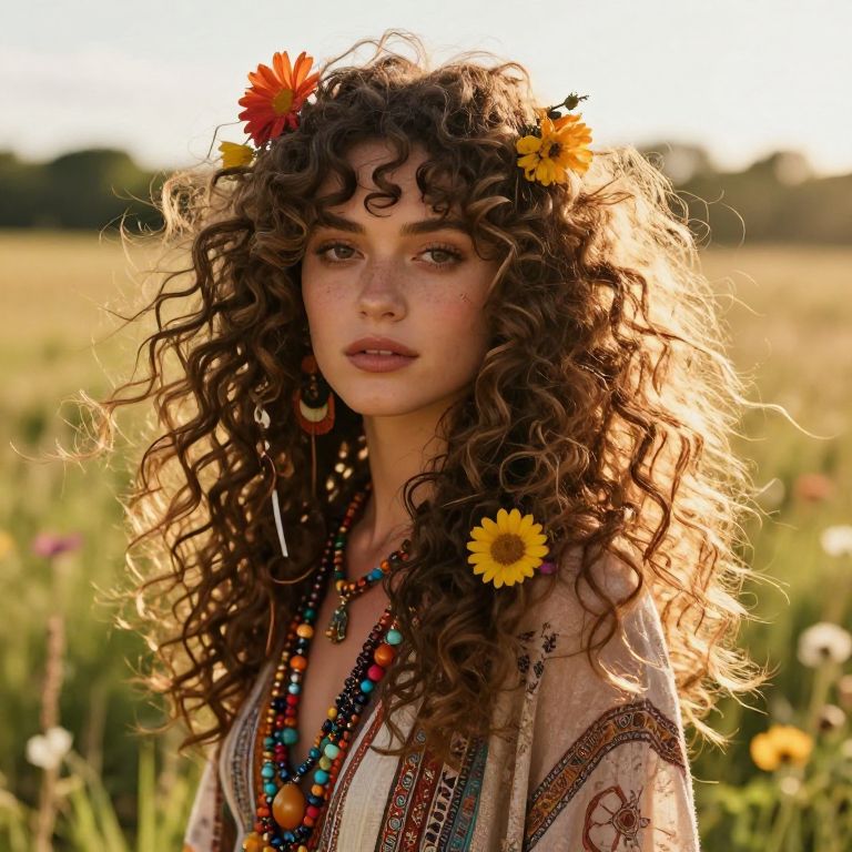 Hippie curly hair flowing freely in a sunlit meadow, adorned with vibrant flowers and colorful beads, soft natural light highlighting the texture and volume, bohemian style vibe with a warm, golden hour atmosphere.