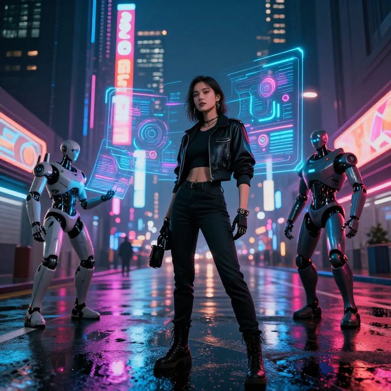 Photograph of a cyberpunk cityscape at night. A young woman with shoulder-length dark hair, wearing a black leather jacket, black pants, and black gloves, stands confidently in the center. She holds a gun in her right hand. Flanking her are two robotic figures with metallic bodies. Neon signs in pink, blue, and white light up the background, creating a vibrant, futuristic atmosphere. The wet street reflects the neon lights, adding to the cyberpunk aesthetic. The scene is dynamic and intense, with a strong sense of urban, futuristic style.