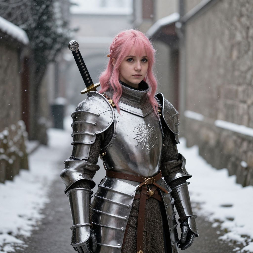 A young woman with pink hair and a baby face wears medieval European light armor, standing in front of a narrow winding pathway with snow falling, her Japanese sword visible on her back.