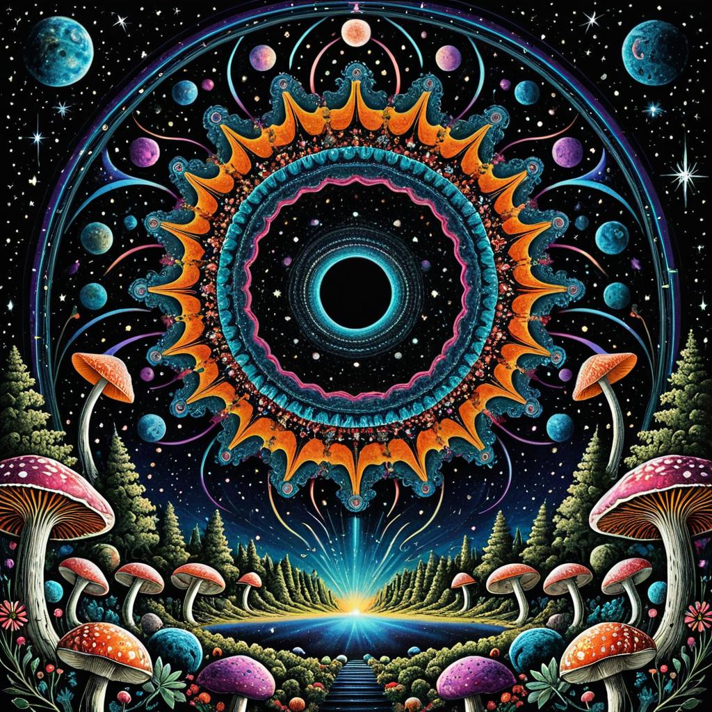 Vintage 70s psychedelic surreal sci-fi collage, psychedelic black hole vortex, color-shifting space flora, surreal alien landscapes, robotic space creatures, crystallized mushroom rings, fractal kaleidoscope geometry, black night sky with stars