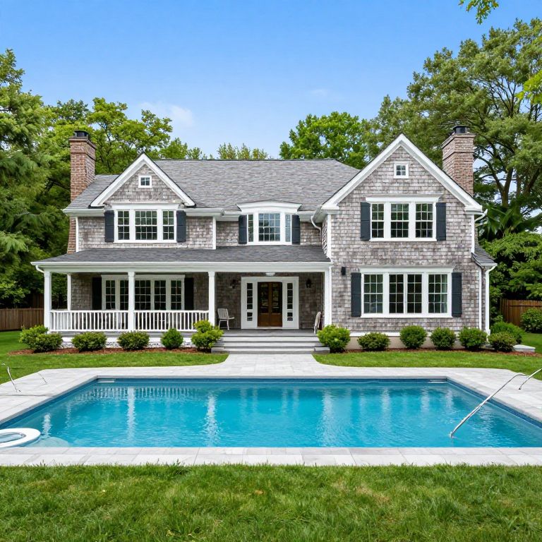Photograph of a large, two-story, gray-shingled house with white trim, a wrap-around porch, and a clear blue swimming pool in