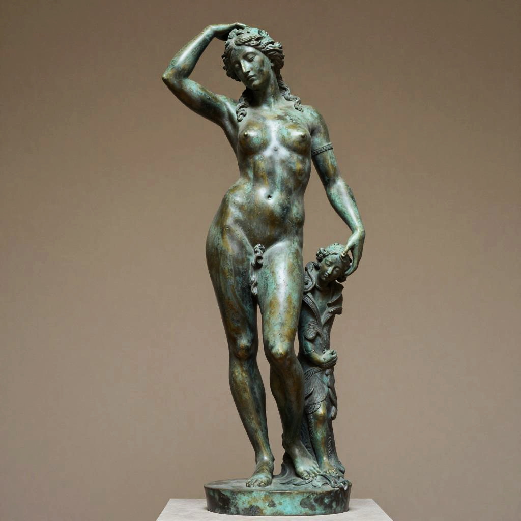 Detailed bronze statue with green patina depicting a full-body portrait of a beautiful, nude enchantress in a seductive pose. The statue features intricate details including flowing hair and a small figure beside her. Displayed on a round base, the sculpture is illuminated with soft, diffuse museum lighting highlighting its textures and aged patina.
