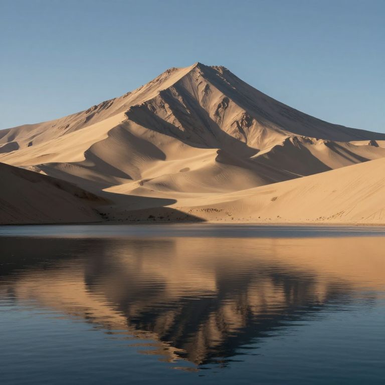 Photograph of a mountainous desert landscape at sunrise. A tall, rugged mountain with steep, sunlit slopes dominates the background, casting sharp shadows. The mountain is bathed in warm, golden light, contrasting with the clear, deep blue sky. In the foreground, a calm, reflective lake mirrors the mountain's image, adding a serene quality to the scene. The sand dunes surrounding the lake are light beige, with gentle undulations. The overall composition highlights the natural beauty and tranquil atmosphere of the desert environment.