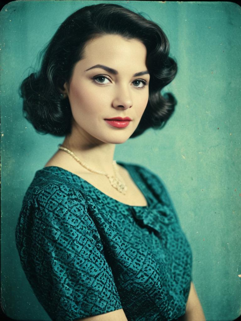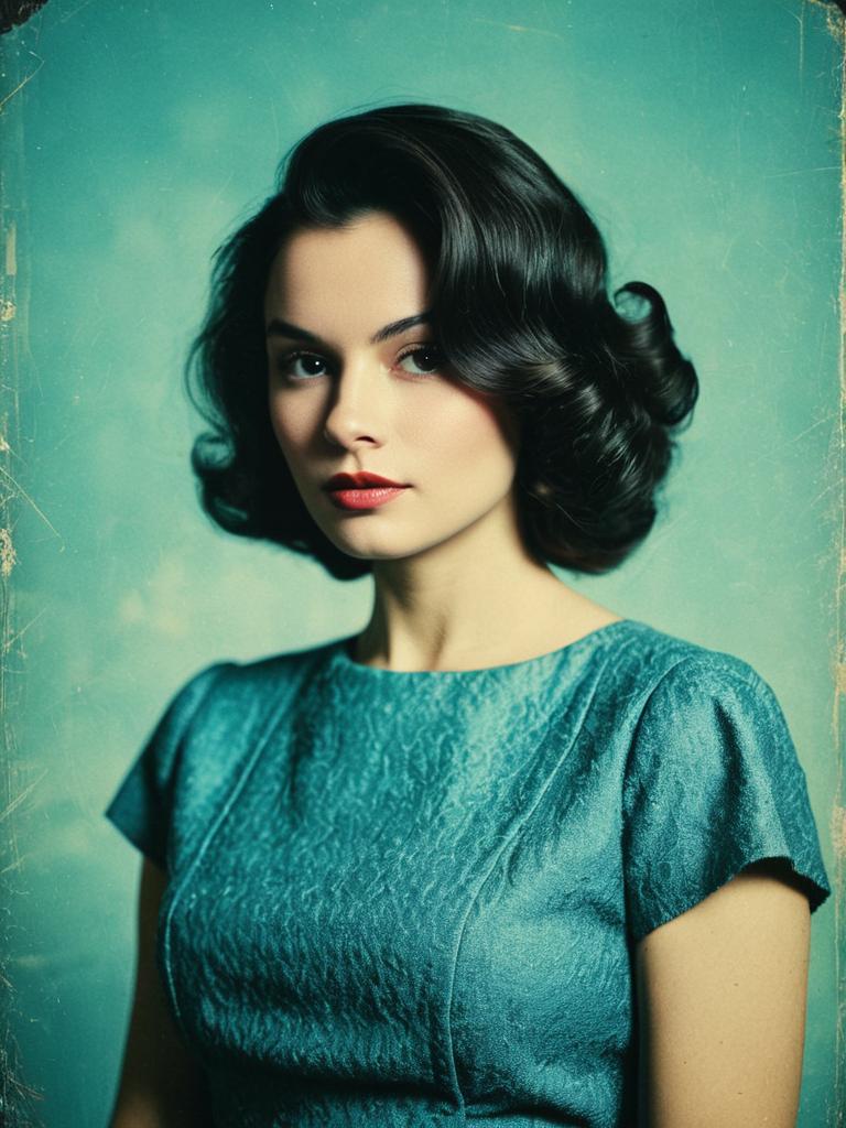 Close-up portrait of a young woman with styled black wavy hair and red lipstick, wearing a teal one-shoulder top, set against a textured teal background. The image has a vintage aesthetic with subtle photo aging effects.