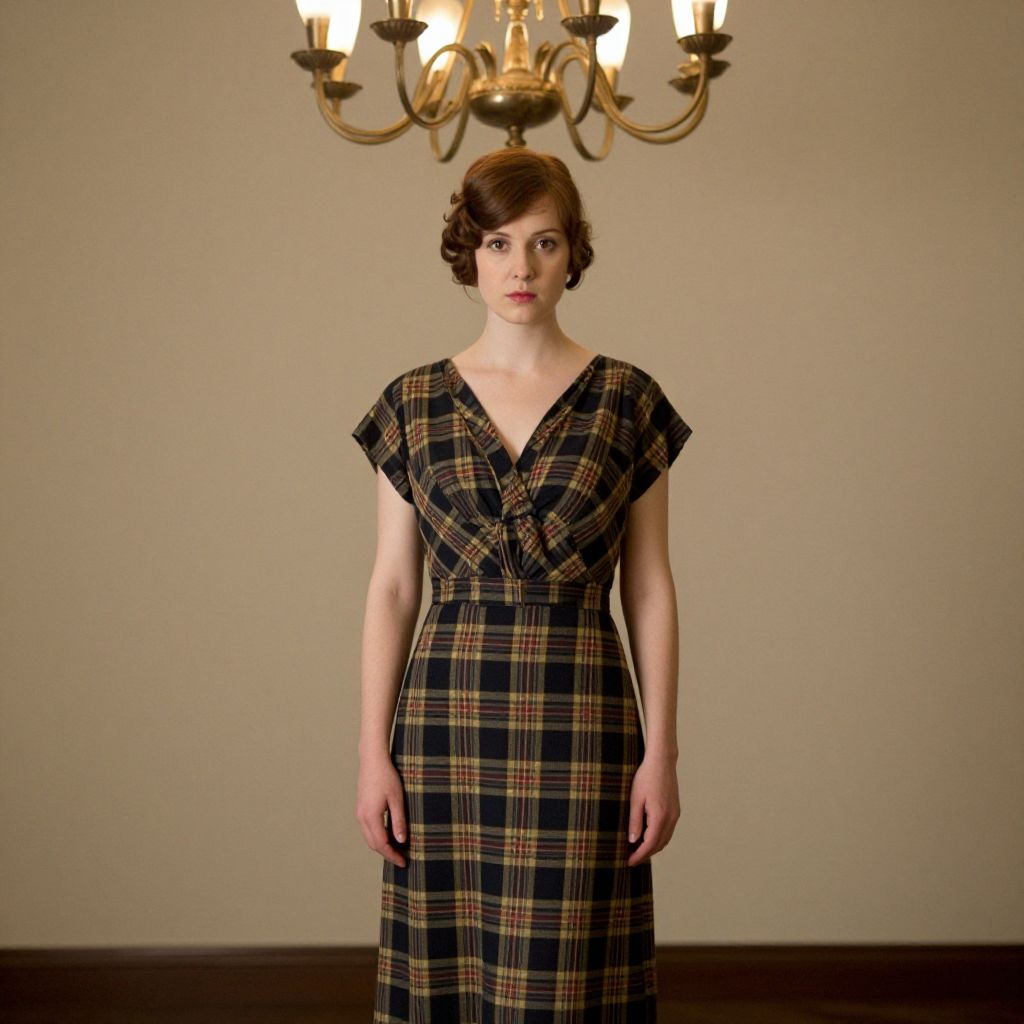 1920s Costume Woman, woman in a plaid dress standing in front of a wall with a chandelier