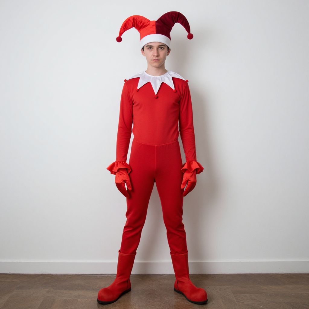Photograph of a young man in a red jester costume with white collar, jester hat, gloves, and boots, standing against a plain white