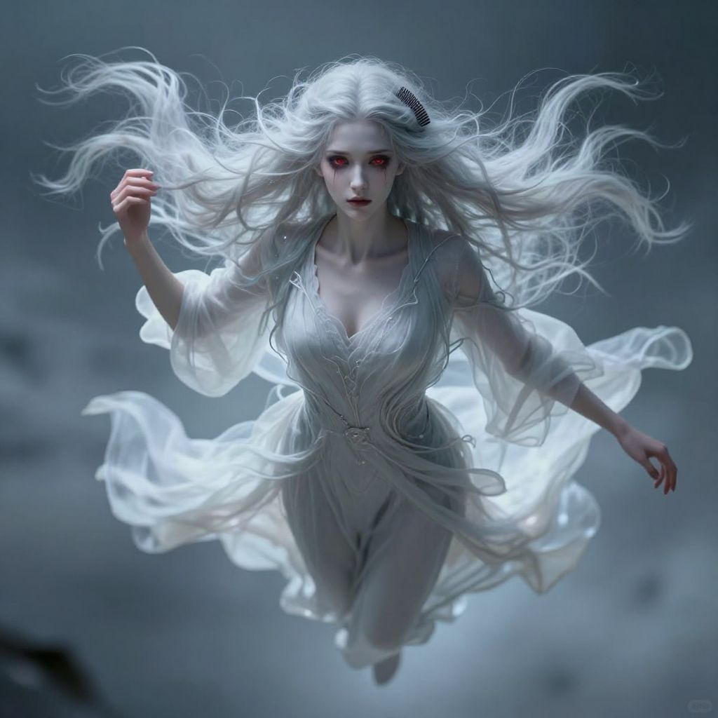 Digital artwork of a ghostly woman with long, flowing white hair and pale skin, floating mid-air. She wears a translucent white dress with intricate lace details, revealing a slender physique and modest breasts. Her red eyes are striking against her ethereal appearance. The background is a dark, cloudy sky, adding to the supernatural atmosphere. Her hair and dress billow around her, creating a sense of movement. The image has a surreal, otherworldly style with a focus on light and shadow contrasts.