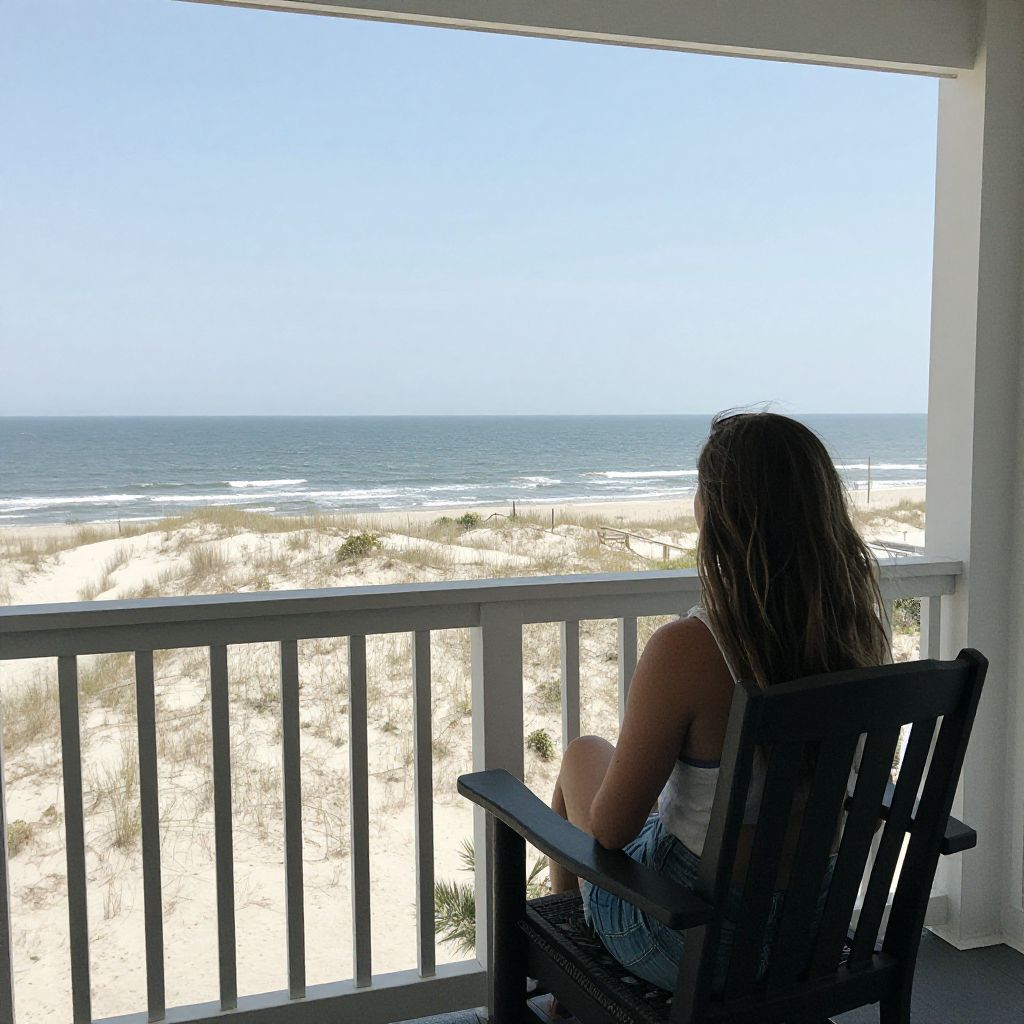 Woman seated in a dark wooden chair on a balcony, gazing out at the expansive ocean view from the Outer Banks in North Carolina, with sand dunes and sparse vegetation visible beyond the white railing.