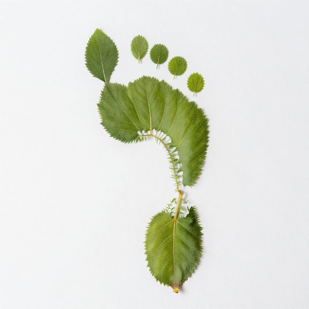 Photograph of a green leaf footprint on a white background, taken from a top-down angle. The footprint is made up of five leaves: a large leaf at the heel, a smaller leaf at the arch, and three tiny leaves forming the toes. The leaves have visible veins and are brightly lit with even, soft lighting. The background is completely white and blurred, with a shallow depth of field focusing on the leaf footprint.
