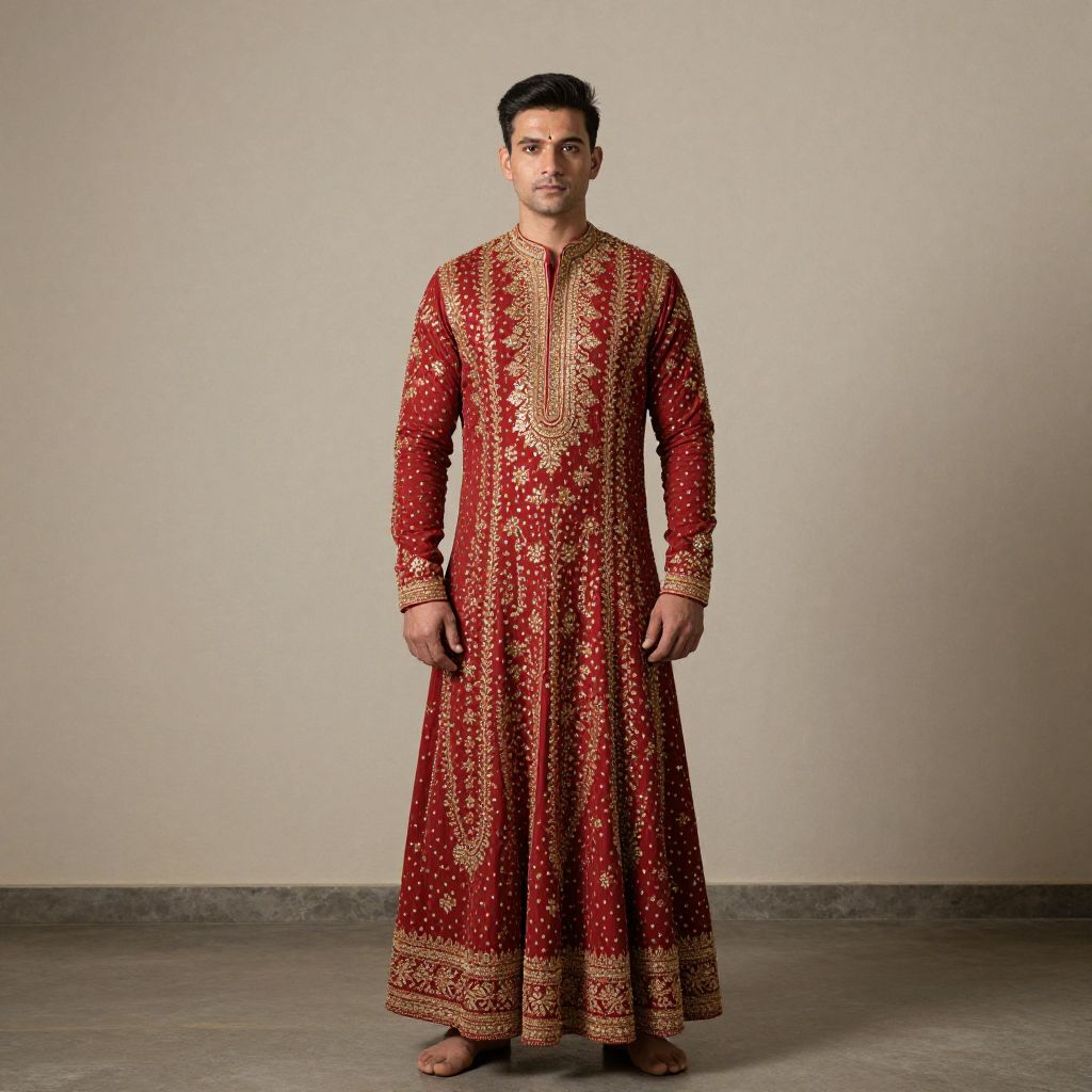 "Traditional Dress Puja, man in a red and gold outfit standing in front of a wall"