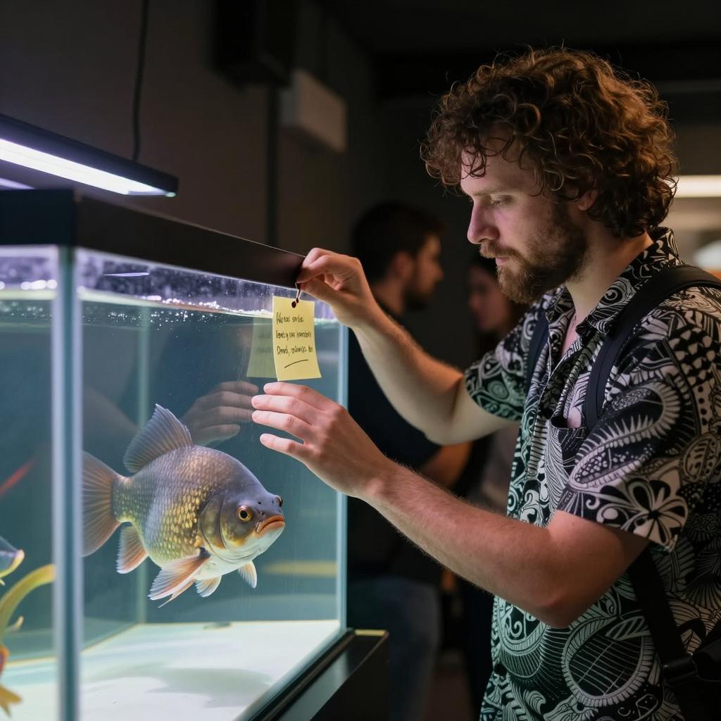 A man with curly brown hair and a beard, wearing a black and white patterned shirt, reaches into a large fish tank. A large fish with a round head is inside the tank. Dark, dimly lit background. A note is attached to the tank's frame. Two people are partially visible in the background.