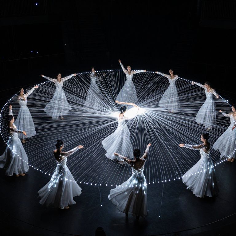 Photograph of a stage performance featuring eight female dancers in white, flowing gowns with delicate, ethereal textures. They form a circular pattern, arms extended, creating a radiant, starburst effect with illuminated white lines extending from a central bright light. The dancers are positioned in a clockwise direction, their movements graceful and synchronized. The dark background contrasts with the luminous costumes and lines, emphasizing the circular, dynamic composition. The lighting is dramatic, highlighting the dancers and creating a sense of depth and motion.