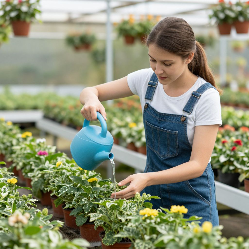Woman Watering Plants in Nursery