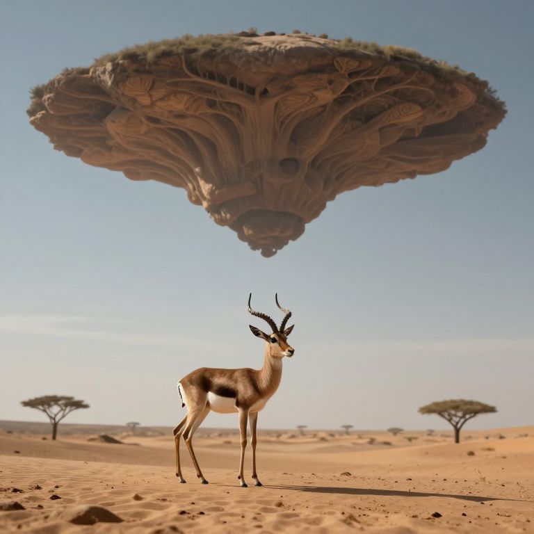 Photograph-style CGI of a slender antelope with long, curved horns standing in a desert under a massive, floating, mushroom-like structure.