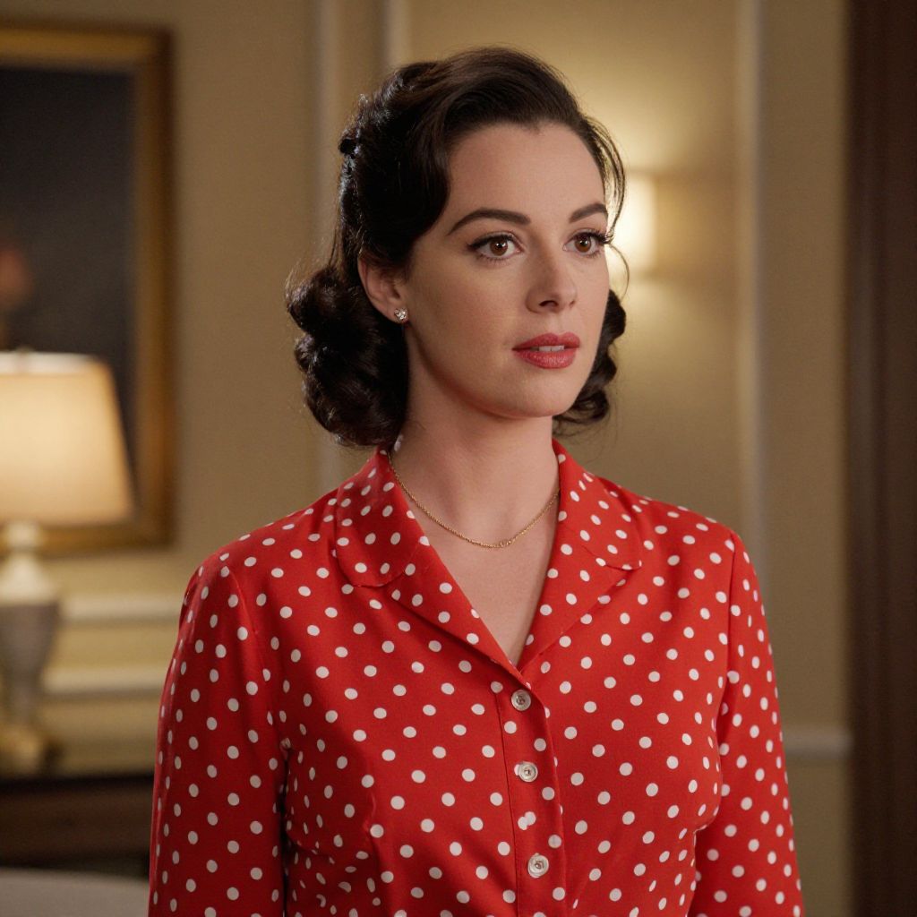 Woman wearing a vibrant red polka-dot blouse and a delicate gold necklace stands in a warmly lit room, her dark hair styled in a classic 1950s updo, exuding elegance and charm reminiscent of the *The Marvelous Mrs. Maisel* series available on Amazon Prime.