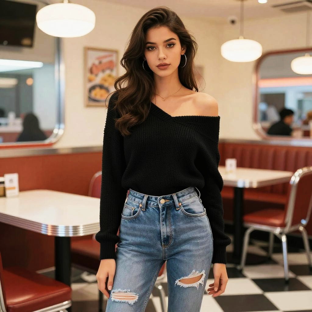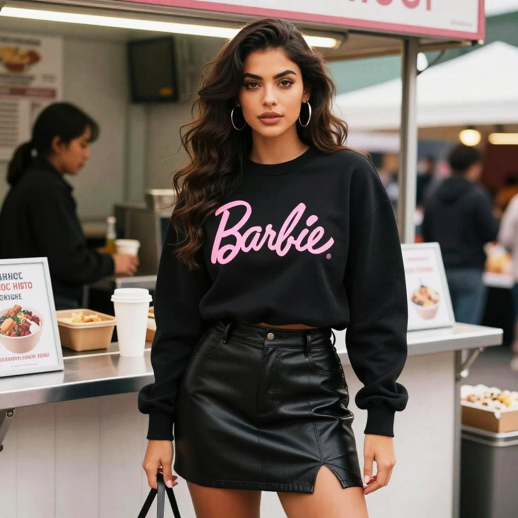 A Stocky woman in urban streetwear, wearing a black graphic sweatshirt with a pink Barbie logo tucked into a high-waisted faux leather mini skirt, hoop earrings, and long wavy hair, standing at the takeout counter at a farmers market, in a tokyopop visual style. Sexy. Pretty face and beutiful eyes
