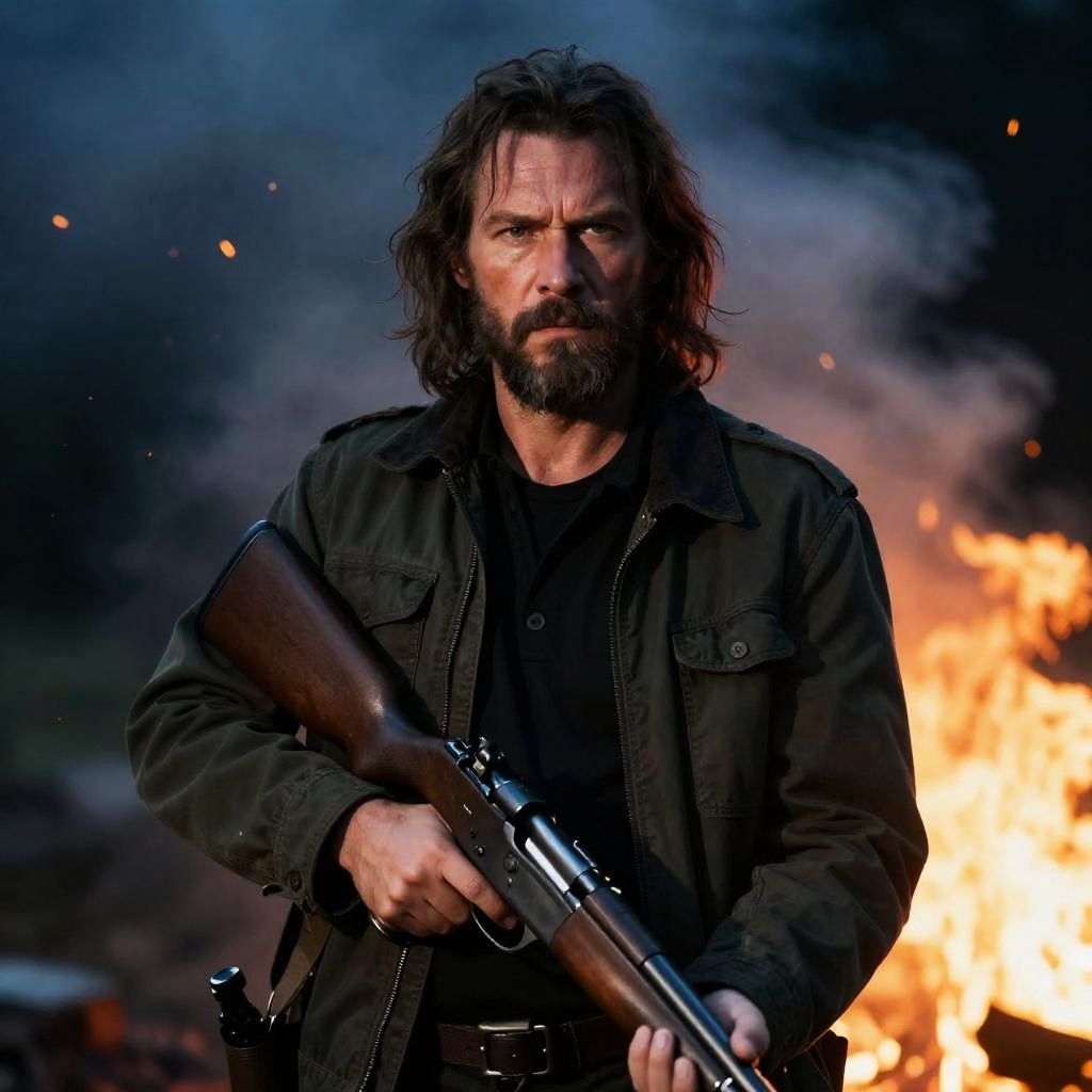 Grizzled middle-aged man with long, unkempt hair and beard, intense expression, holding a rifle in his right hand and a pistol in his left. Dark green jacket, black shirt. Blue smoke and orange sparks surround him. Large fire in the background. Low lighting. Dark, intense atmosphere.