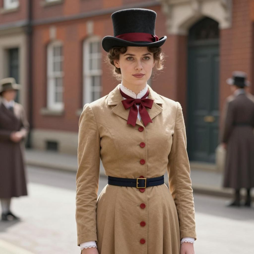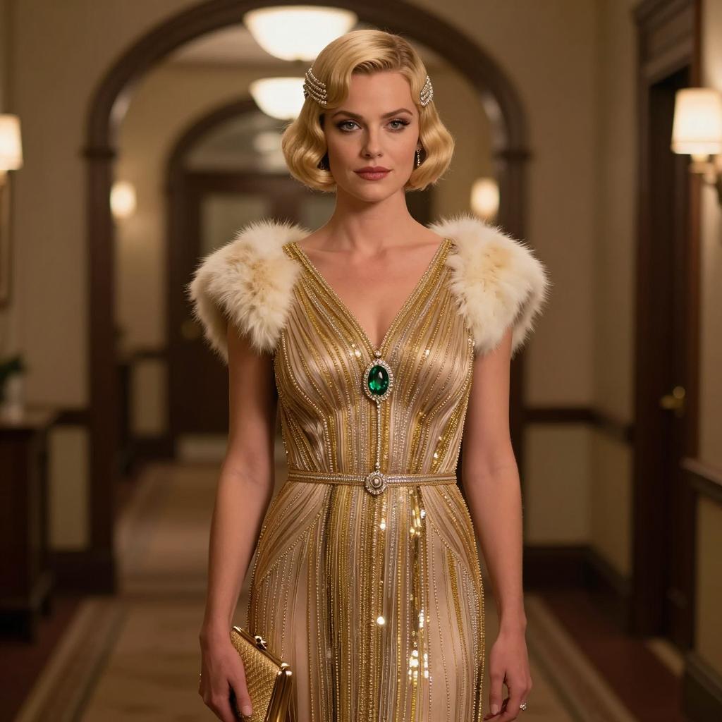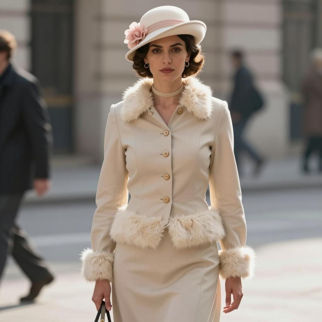 Portrait of a stylish woman wearing a beige 1920s-inspired outfit, including a fur-trimmed long-sleeve button-up blouse with gold buttons, matching cream skirt, and a cream hat adorned with a pink flower. She accessorizes with gold hoop earrings and a choker necklace. The photo is taken outdoors in an urban setting during daytime with soft lighting and a slightly blurred background featuring people walking.
