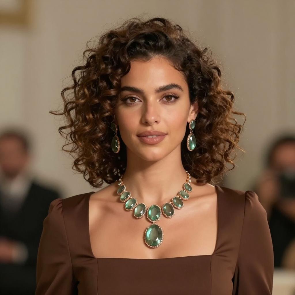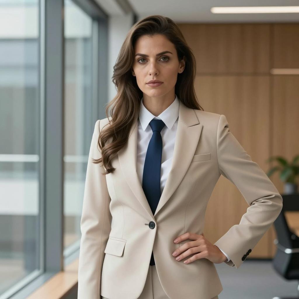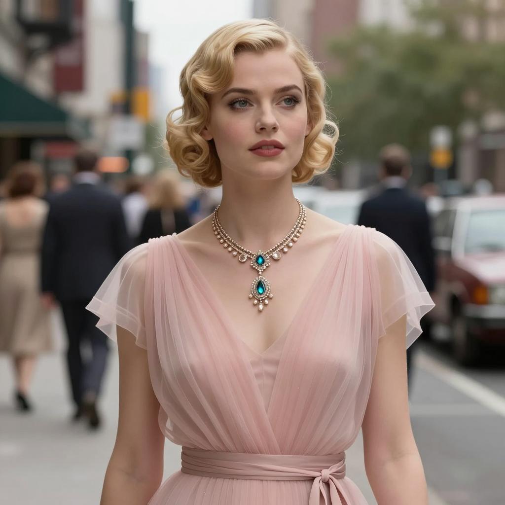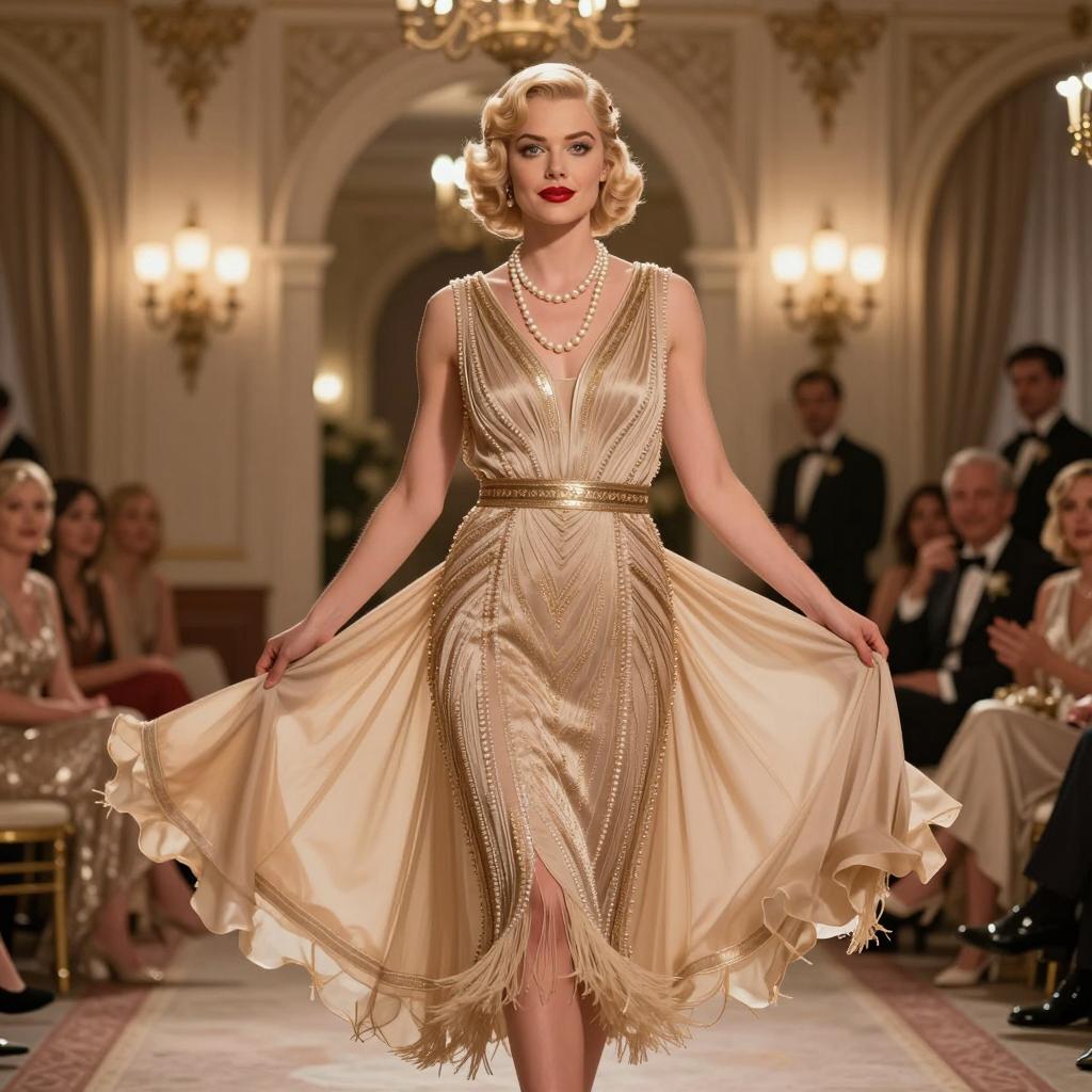 Portrait of a stylish woman wearing a beige 1920s-inspired outfit, including a fur-trimmed long-sleeve button-up blouse with gold buttons, matching cream skirt, and a cream hat adorned with a pink flower. She accessorizes with gold hoop earrings and a choker necklace. The photo is taken outdoors in an urban setting during daytime with soft lighting and a slightly blurred background featuring people walking.