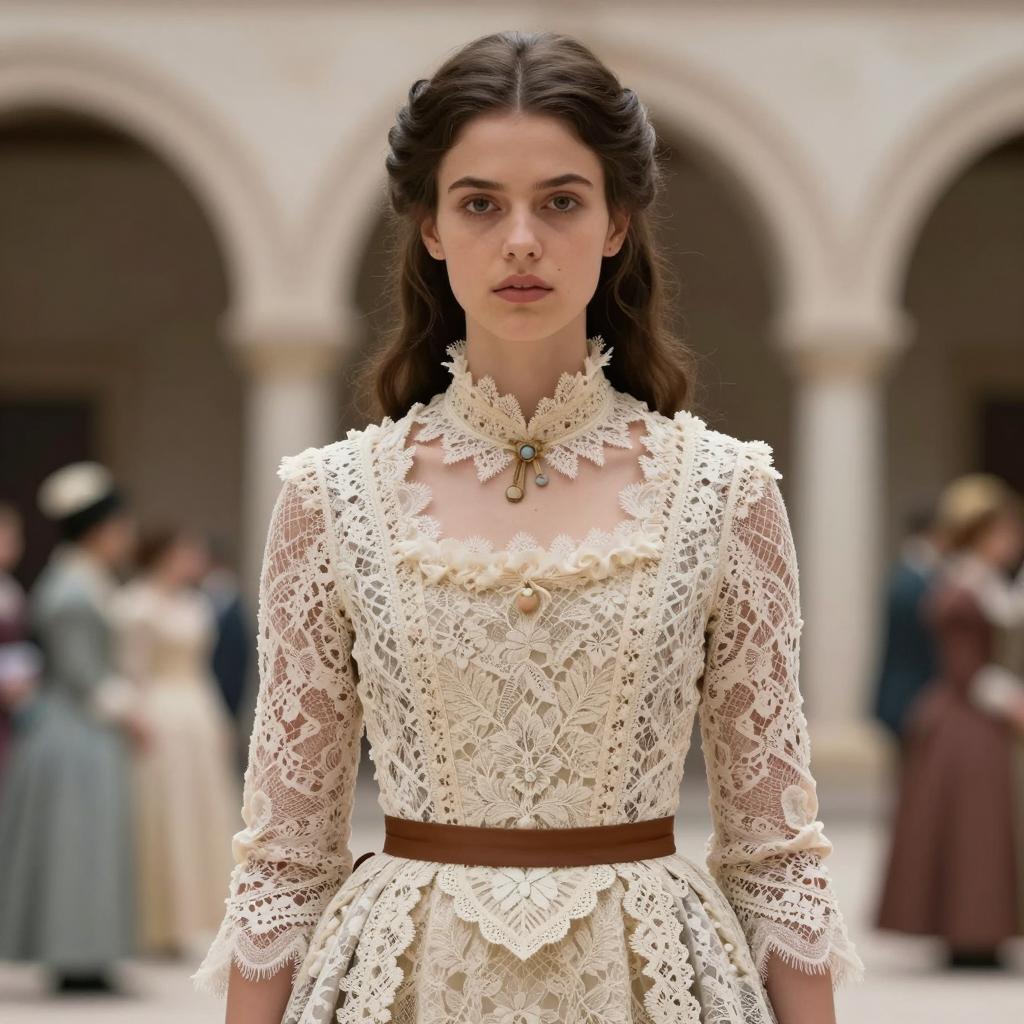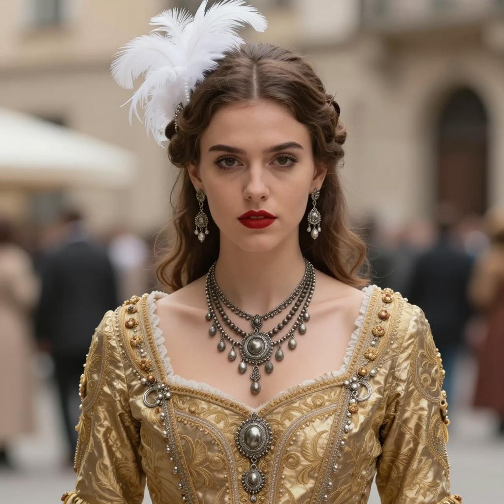 Chica costume, photograph of a woman, realistic style, standing outdoors, daytime, soft lighting, beige and cream color palette, vintage 1920s fashion, long-sleeve button-up blouse, beige with gold buttons, cream fur trim, cream skirt, cream hat with pink flower, gold hoop earrings, choker necklace, serious expression, slightly blurred background, urban setting, people in background, elegant and sophisticated, detailed ures, realistic shadows, medium shot, fashionable and stylish