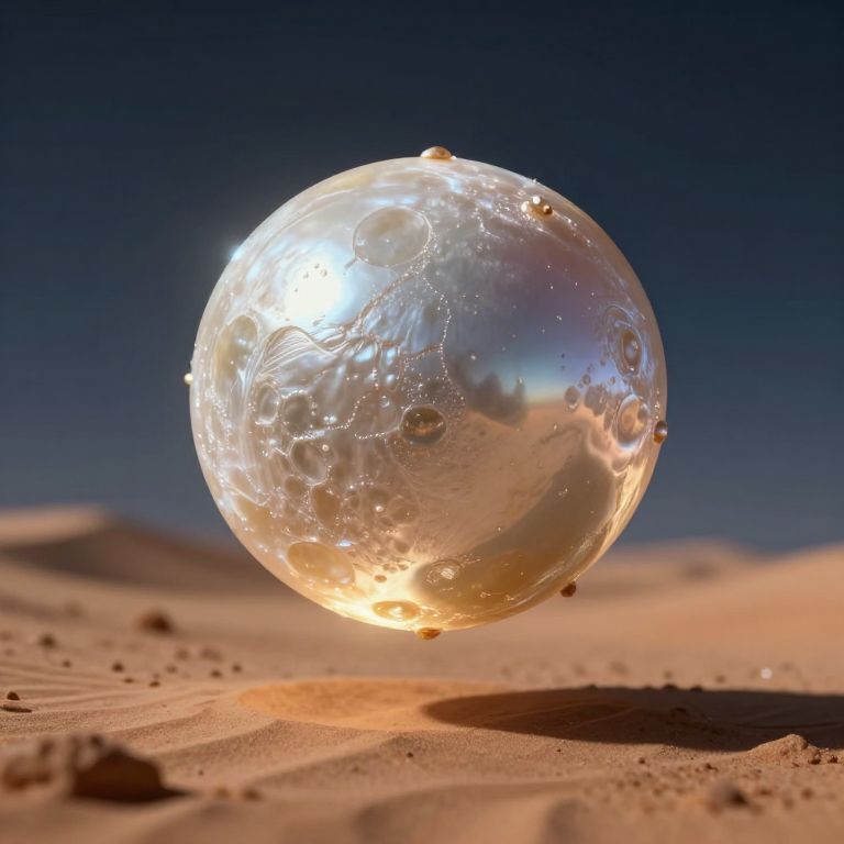 A moon-sized pearl floats above an alien desert, glowing with the memories of civilizations that once called it home.