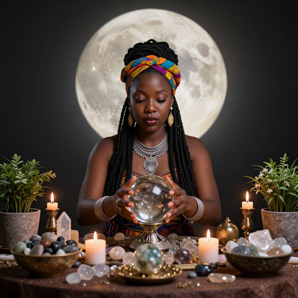 In this 4k photograph, an African woman is immersed in a full moon ritual, surrounded by a rich array of crystals, candles, and herbs. She is adorned with intricate jewelry, including a silver necklace and gold earrings, and her hair is styled in long, braided dreadlocks wrapped in a colorful headwrap. The woman's hands gently hold a crystal ball, which is the focal point of the scene. The table in front of her is cluttered with various objects, including a bowl of small stones, a lit candle holder, and a potted plant. The background features a large, glowing full moon, casting a warm, ethereal light over the scene. The overall composition is balanced, with the woman and the crystal ball at the center, surrounded by the other elements that contribute to the mystical atmosphere. The interplay of colors, textures, and shapes creates a visually captivating and immersive experience.
