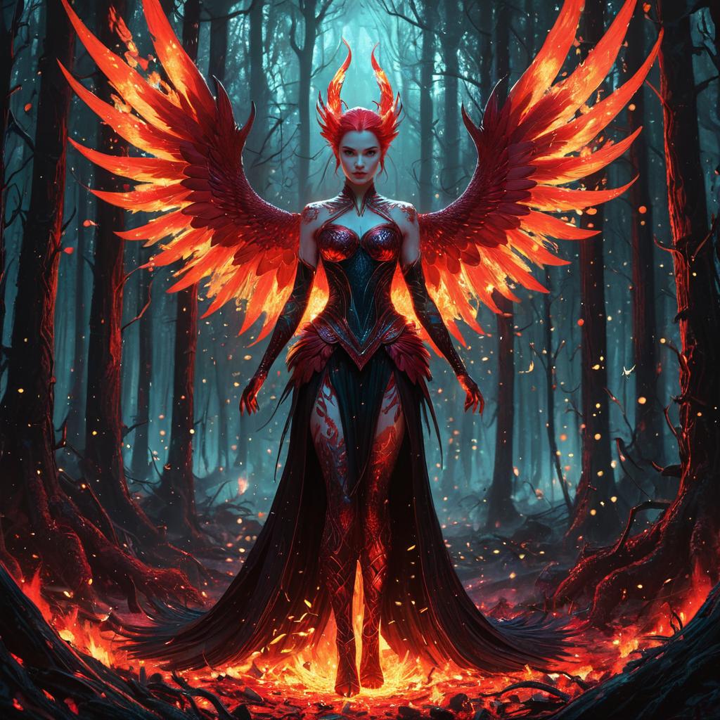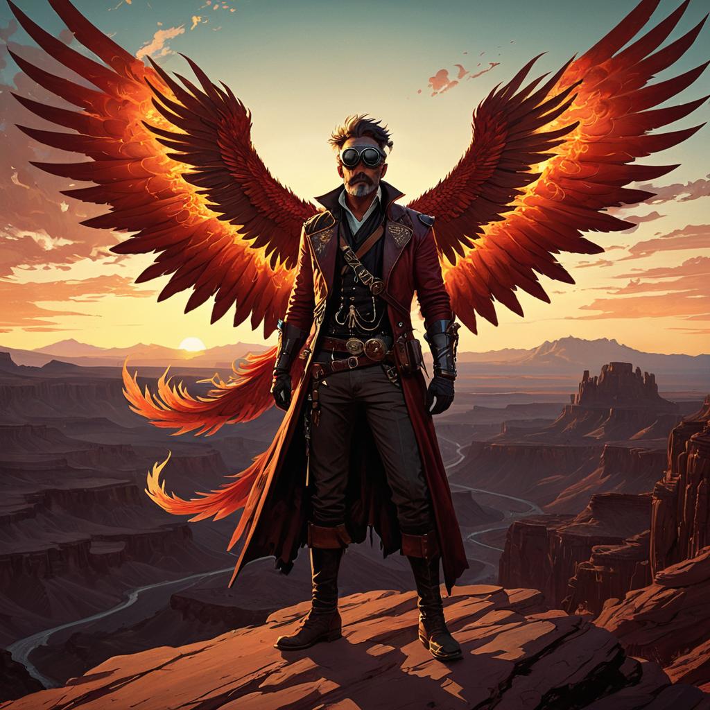 A majestic anthropomorphic fiery phoenix zephyr stands atop a crimson twilight desert canyon, wearing a leather harness and steampunk goggles, cinematic chiaroscuro lighting, digital painting, concept art, artstation, matte finish, sharp focus, illustration, by Alphonse Mucha, Ian McCaig, Feng Zhu