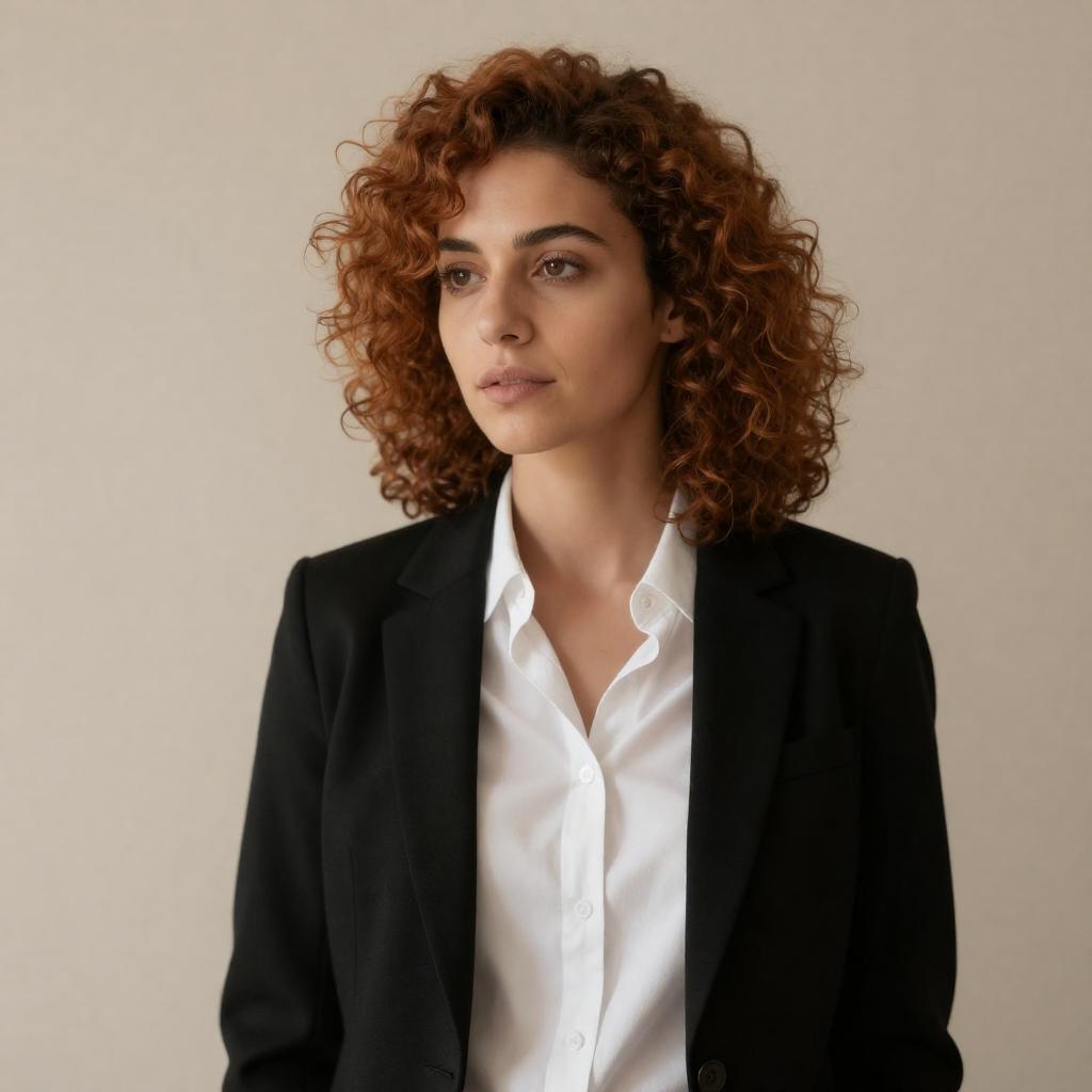 A young woman with curly brown hair and pale skin, dressed in a beige blouse and a patterned scarf, is sitting in a black office chair with wooden armrests. She has a neutral expression and is lightly touching her hair with her right hand. The background features a blurred office setting with muted colors.