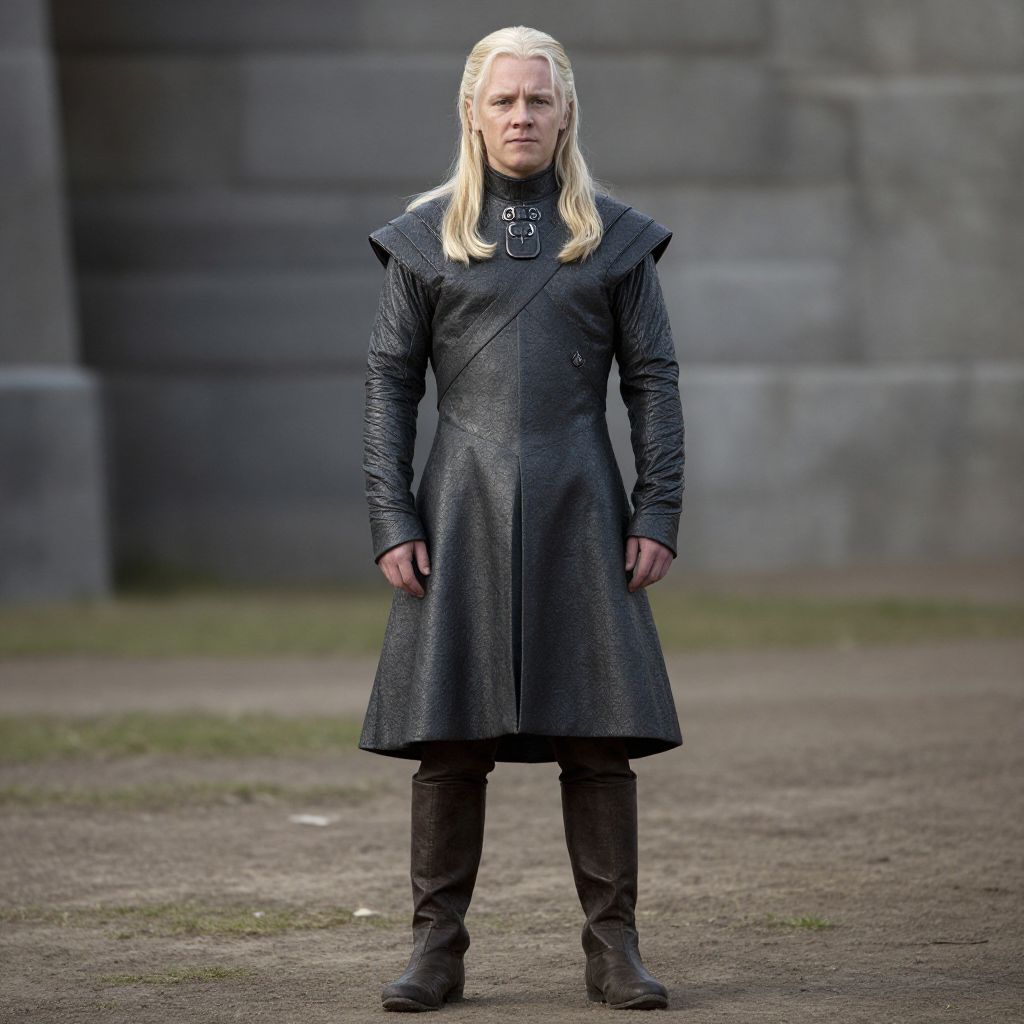 Photograph of a tall, fair-skinned man with long, straight blonde hair, standing outdoors on a dirt path. He is wearing a black, long-sleeved, knee-length coat with a high collar and silver circular brooch near the neck. The coat has a textured, slightly shiny fabric. He also wears dark brown, knee-high boots. The background features a blurred, gray stone wall, suggesting a historical or medieval setting. His expression is neutral, and he stands with his hands by his sides. The overall style is reminiscent of fantasy or historical drama.