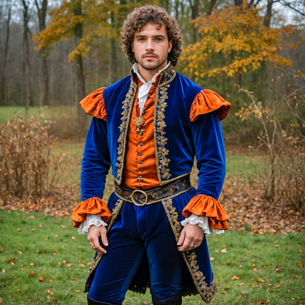 A man with short curly hair wearing a luxurious Renaissance outfit featuring a royal blue velvet doublet with fiery orange puffed sleeves, intricate gold embroidery, lace ruff, and brocade fabric details. The background shows a historic castle with turrets and manicured gardens, creating a period atmosphere.