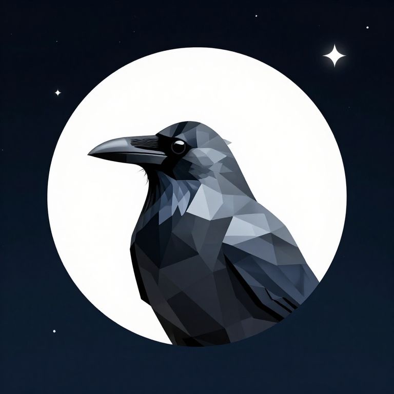 Digital artwork of a stylized black crow set against a large, bright white full moon. The crow is rendered in a low-poly, geometric style with varying shades of blue and black, creating a faceted, angular appearance. The crow's sharp beak and small, white, reflective eye are prominent. The dark blue background has small white stars, adding a night sky effect. The overall composition is minimalist and striking, with a strong contrast between the dark crow and the bright moon. The art style is modern and abstract.