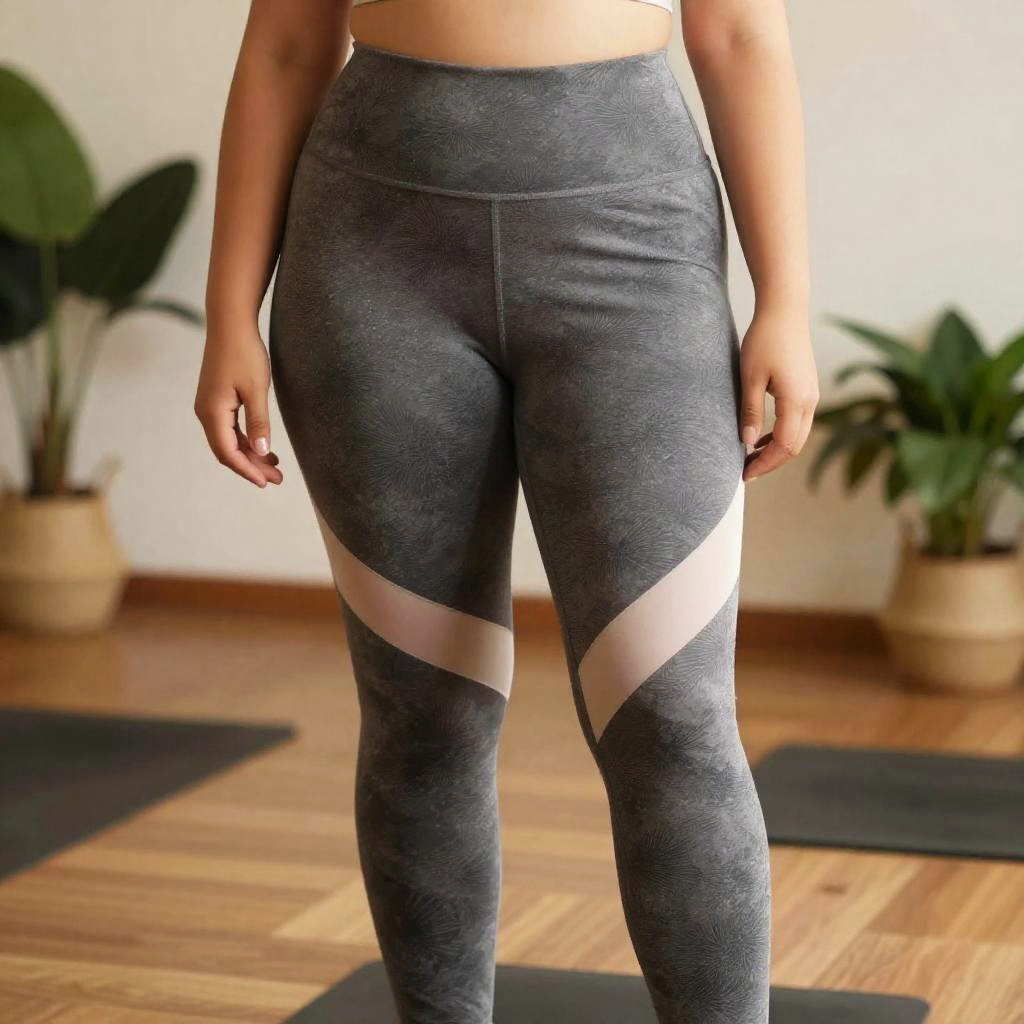 Fat girl yoga pants detailed texture close-up, emphasizing stretch fabric and bold patterns, indoor studio with yoga mats and plants, warm ambient lighting capturing a serene and empowering vibe.