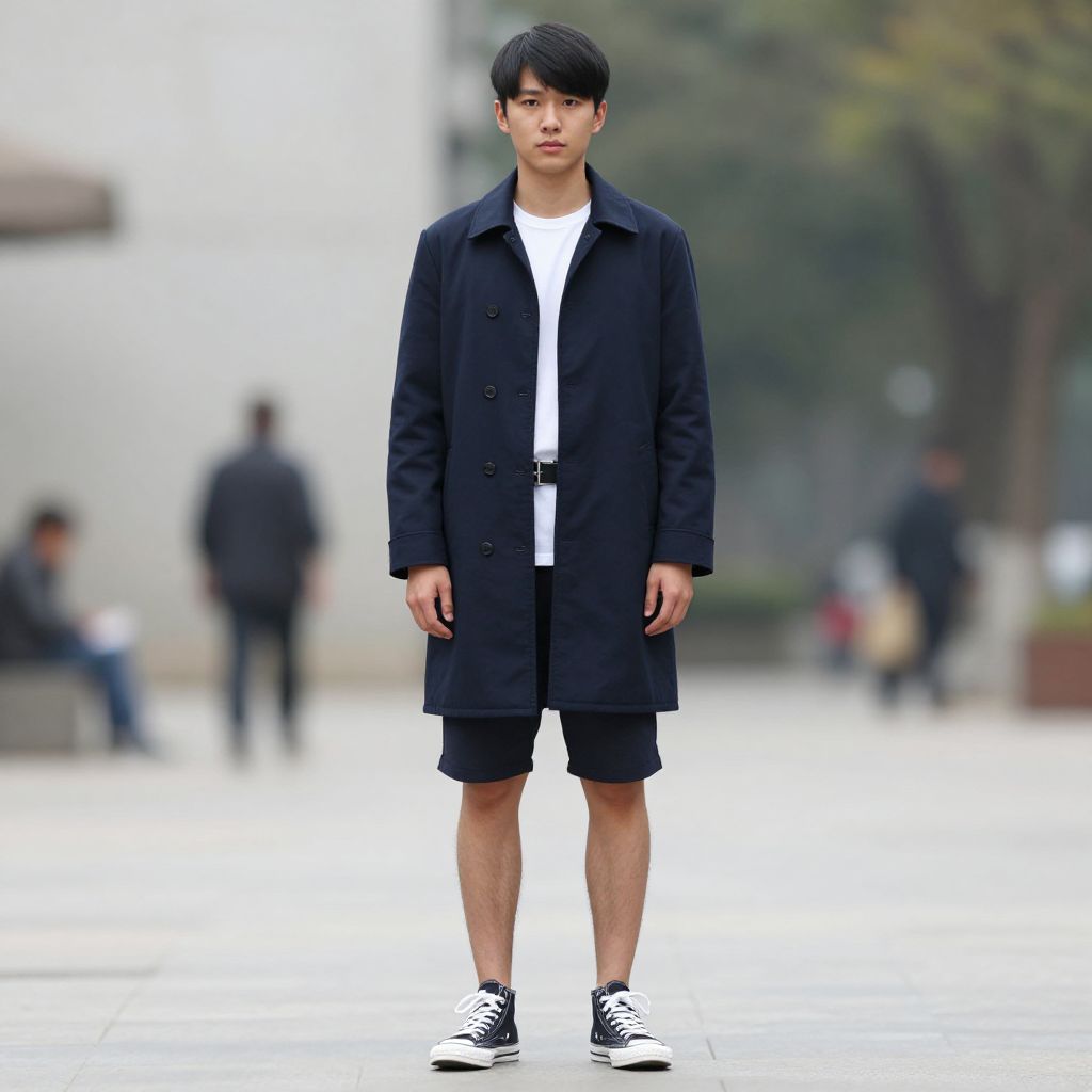 Photograph of a young Asian man standing outdoors in a city setting. He has short black hair and a neutral expression. He is wearing a long, black, double-breasted coat over a plain white t-shirt and black knee-length shorts. His outfit is completed with black and white sneakers. The background is slightly blurred, showing an urban environment with a few indistinct people, trees, and buildings. The overall color palette is muted, with the black coat and shorts contrasting against the white t-shirt and grey pavement. The photograph has a modern, casual fashion style.