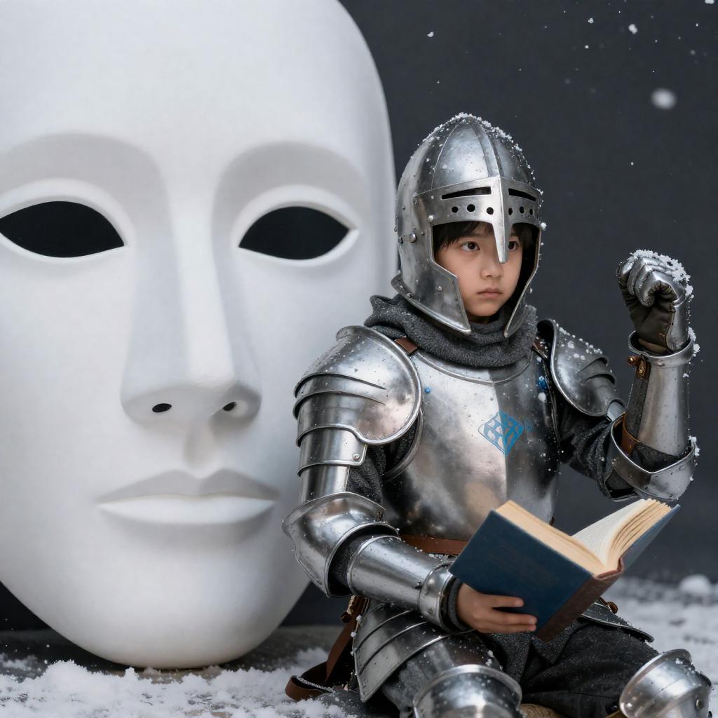 Photograph of a child in medieval-style armor with a silver helmet, seated against a large white mask of a face. Child has light skin, dark hair, and a determined expression. Snow falls around them. Child holds a book in one hand, raised in the other. Dark background. Child's armor has blue and silver accents. Large mask occupies left side of the image.