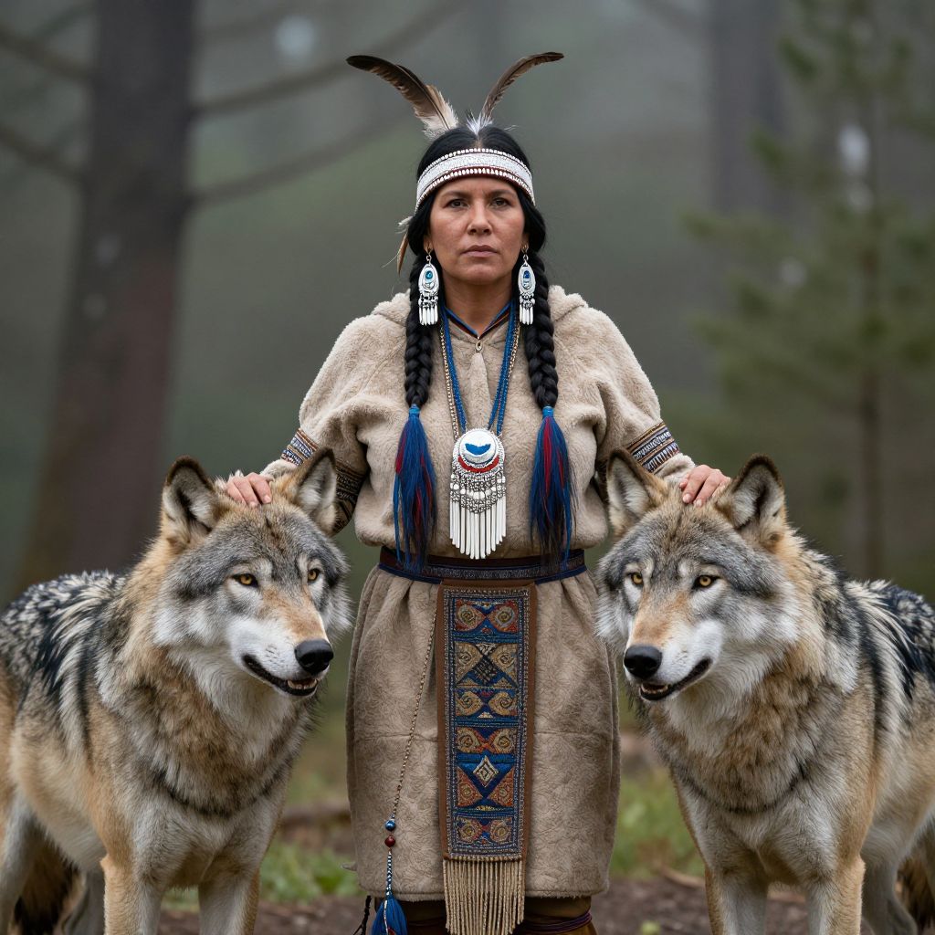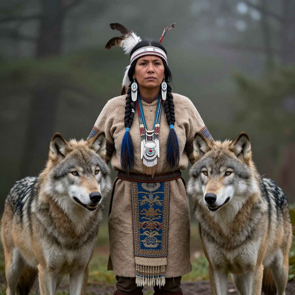 Native American woman adorned in traditional attire stands confidently between two wolves, her headpiece featuring feathers and jewelry complementing her earth-toned ensemble against a misty forest backdrop.