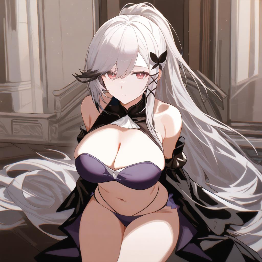Digital illustration of an anime-style female character with long grey hair tied in a ponytail, red-pink eyes, and a butterfly hair ornament. She is wearing a revealing purple bikini and a black shawl draped over her arms, showcasing cleavage and thighs. The background features a softly lit, muted architectural setting.