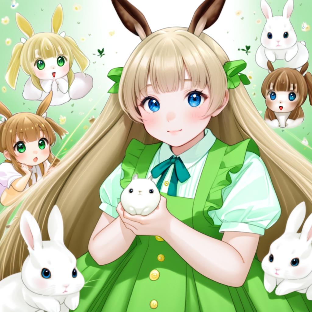 An anime-style illustration of a girl with long blonde hair, blue eyes, and brown rabbit ears. She is wearing a green dress with ruffled sleeves and a teal bow tie. The girl is holding a small white rabbit, surrounded by several white rabbits and chibi-style characters with rabbit ears and large eyes. The background is light green with soft glowing effects and floral elements.