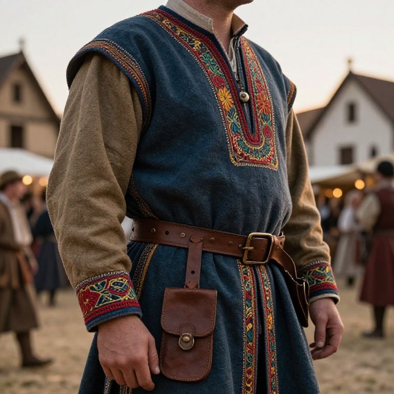 Medieval minstrel costume detailed with vibrant fabrics, embroidered patterns, and leather accessories, set against a rustic village backdrop during a lively festival, warm sunset lighting, intricate textures, cinematic composition