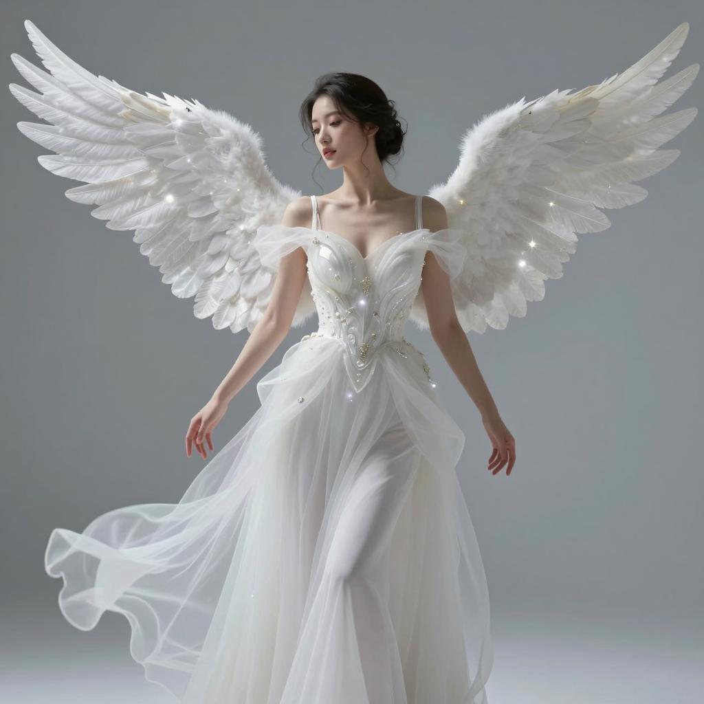 A striking digital artwork of a woman with angelic white wings, dressed in an elegant, flowing gown that emphasizes her graceful silhouette. The image highlights a soft, ethereal glow and intricate details, characteristic of contemporary fantasy art style.