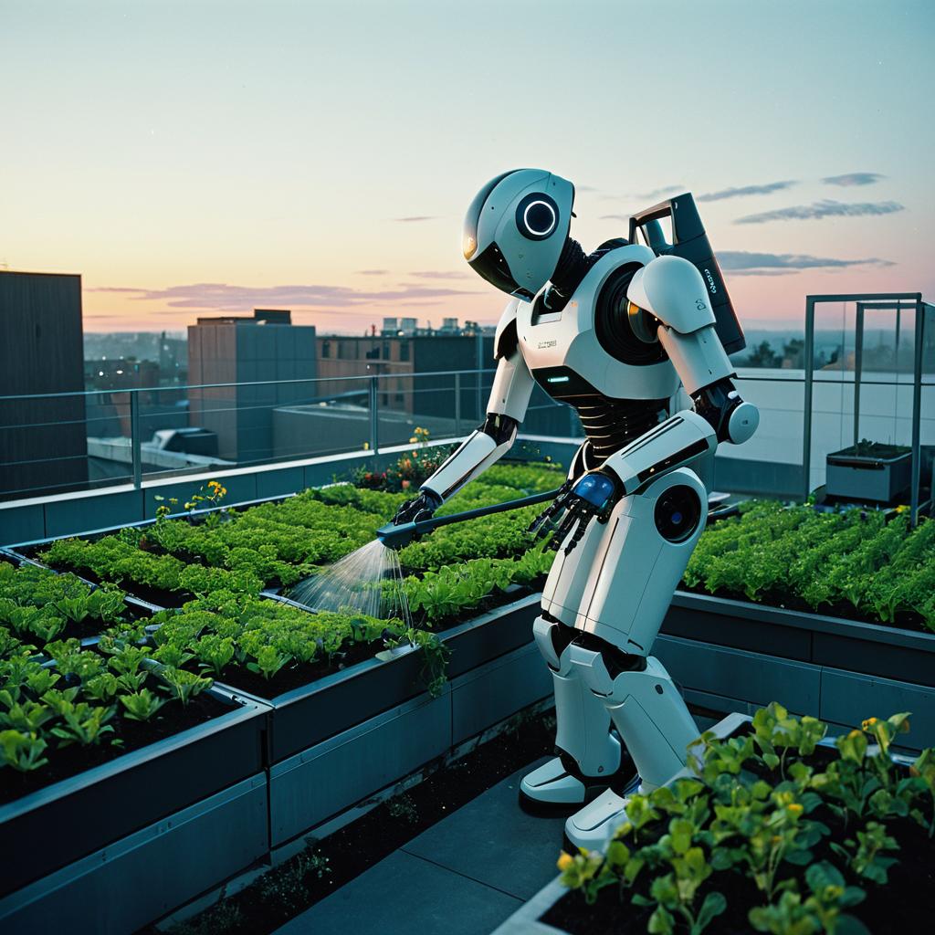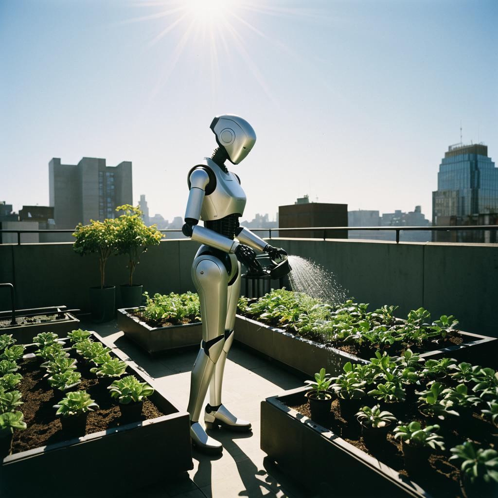 Vintage android assistant named Ava watering plants in a serene Japanese Zen garden, shot as a color photo essay with radial balance, intricate texture and film grain, captured on Kodak Portra 800 film with a Nikon D850 camera by Annie Leibovitz.