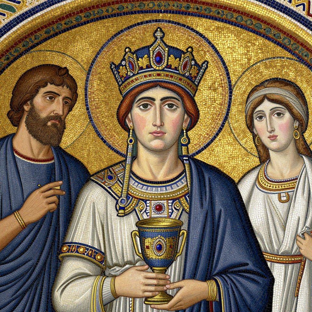 A richly detailed digital artwork inspired by Byzantine mosaics depicts Empress Theodora adorned in an elaborate jewelled crown and ornate shoulder decorations, holding a grand jewelled cup, flanked by a bearded man in blue robes and a woman in white attire, all set against a radiant gold background with intricate border designs.