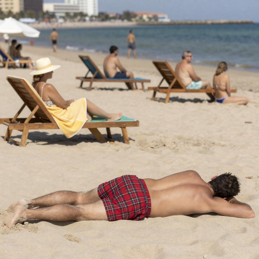 Photograph of a crowded beach. Shirtless man with dark hair, red plaid swim trunks, lying on sand in foreground. Woman in yellow towel and sunhat sits on wooden lounge chair to left. Shirtless men and women in swimwear on lounge chairs and sitting on sand in background. Blue ocean, umbrellas, and buildings in distance. Sunlit, sandy beach, relaxed atmosphere.
