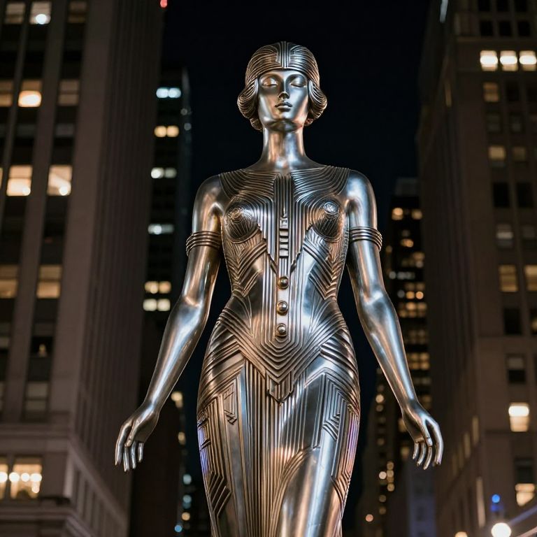 Nighttime urban scene featuring an Art deco goddess in a standing pose, her figure rendered in a mix of chrome and brushed silver, with sculptural metallic lines forming geometric patterns across her torso and limbs, set against a backdrop of skyscrapers with Art deco facades, soft light emanating from the metallic surface of her form