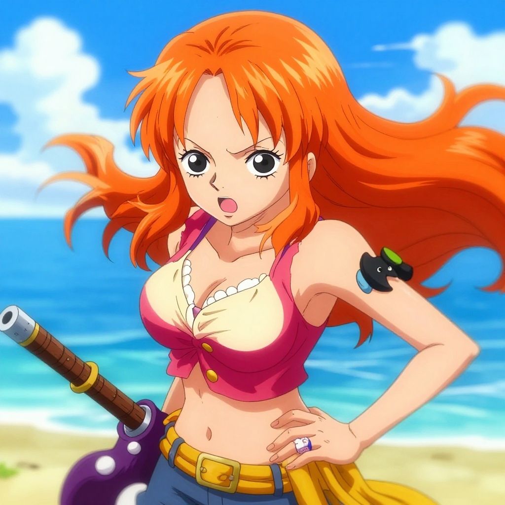 Who is the orange hair girl in One Piece, vibrant anime style portrait, dynamic pose, bright orange hair flowing, detailed expressive eyes, colorful pirate outfit, ocean background