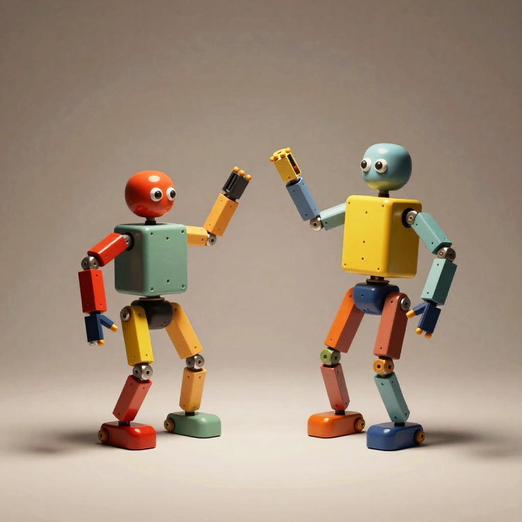 Bruno Munari useless machines featuring colorful, modular robotic components with a retro-futuristic aesthetic, emphasizing motion and balance, illuminated by soft ambient light.