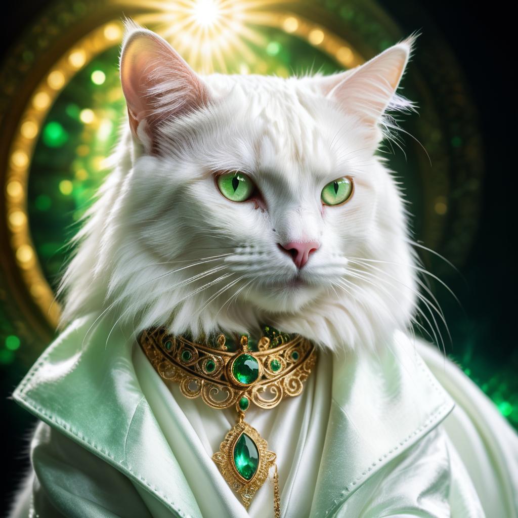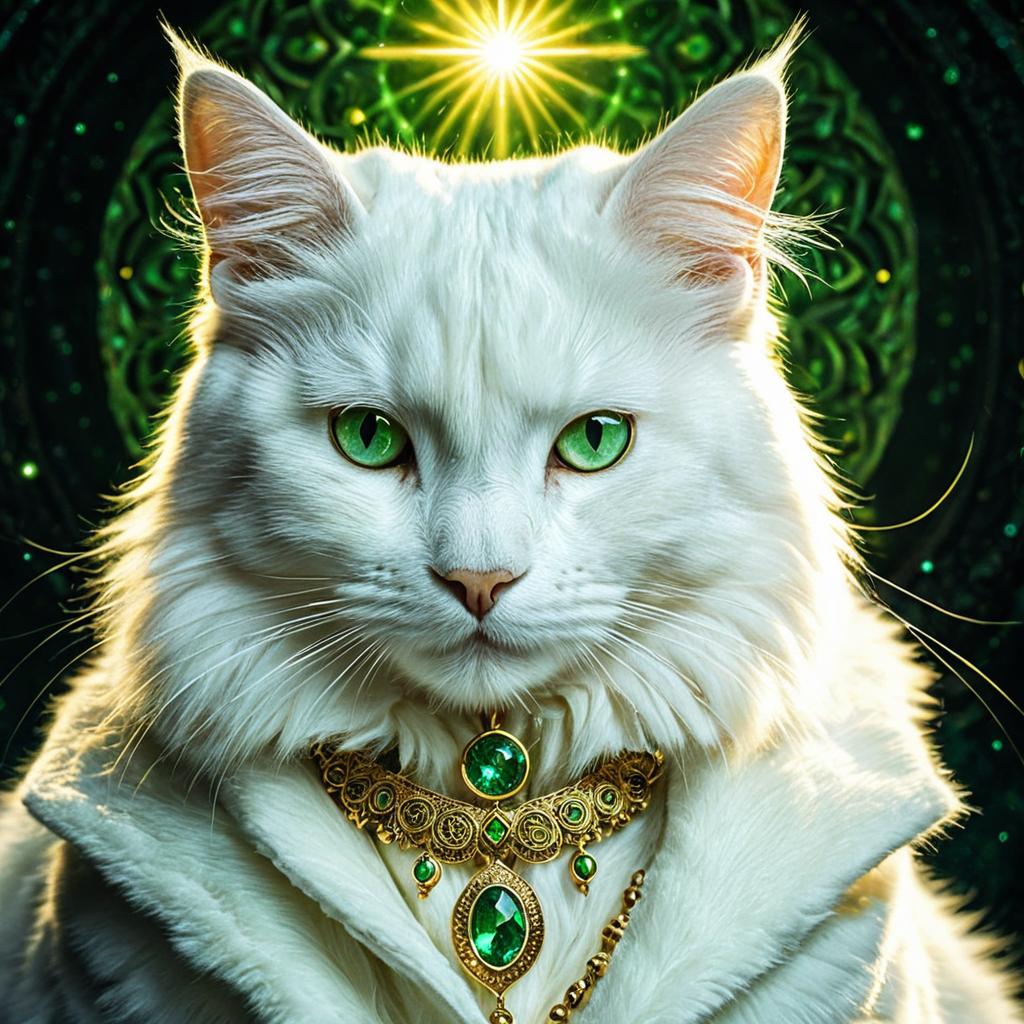 A majestic white cat with detailed fur texture, wearing an elegant white coat and intricate gold and green jewelry, glowing green gem pendant at the center, radiant golden aura surrounding the figure, mystical and fantasy style setting, luminous green eyes, highly detailed and vibrant lighting